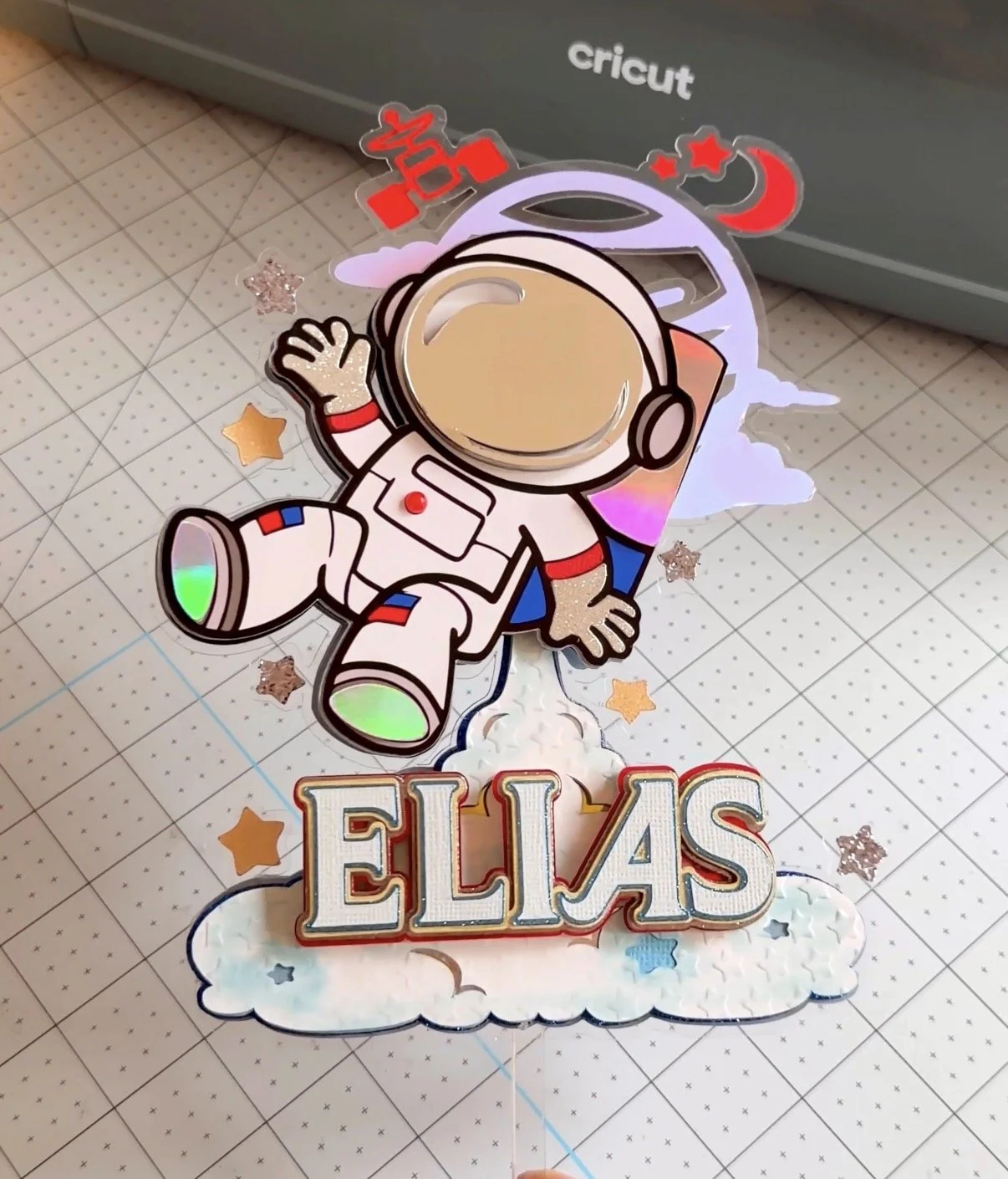 Optional step but a massive game changer to add layers to your print then cut image. This video shows you how to do this on Cricut design space. This means you can add cardstock with different colours/textures to add more detail. Also this is great when you don't want to cut out lots of pieces for an intricate design. Or you may have run out of colour of cardstock or want to match a colour to a theme, then this is the way to go. The cake topper below shows how I used this technique.